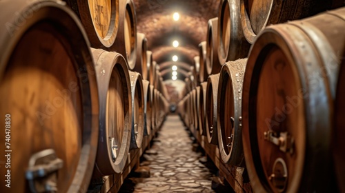 Wine cellar. Wine or whiskey barrels. French wooden barrels