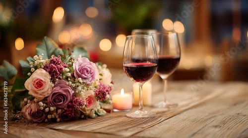 Wine Glasses and Flower Bouquet on Wooden Table at Romantic Dinner Setting
