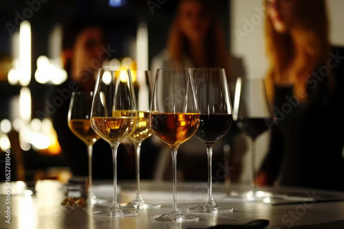 Wine glasses on table with people in background