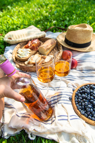 Wine in hands of woman at picnic. Selective focus.