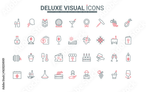 Wine testing and alcohol drink storage, winery line icons set. Grapes growth in vineyard, restaurant menu and temperature in cellar, wineglass thin black and red outline symbols vector illustration
