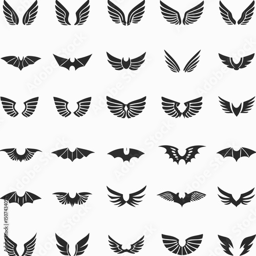 Wing logo designs, vector wing set. Artistic wing illustrations including eagle, angel, bird, bat, and minimalist icons for tattoos, emblems, branding, or fantasy-themed projects.
