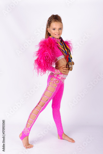 winner! first place! A small girl athlete holds a gold medal
