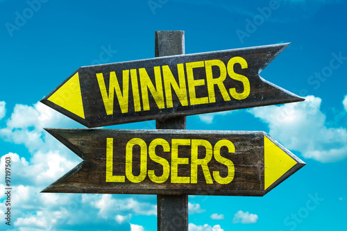 Winners - Losers signpost with sky background