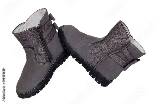 Winter boots. Close-up of a pair elegant gray silver leather winter boots lined with white leather. Girls winter shoe fashion new trends isolated on a white background. Macro photograph.