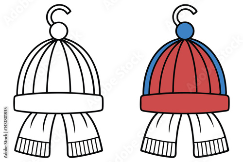 Winter Clothes Cartoon Icon, Hat with Scarf, One is Colored, Outline Style Design