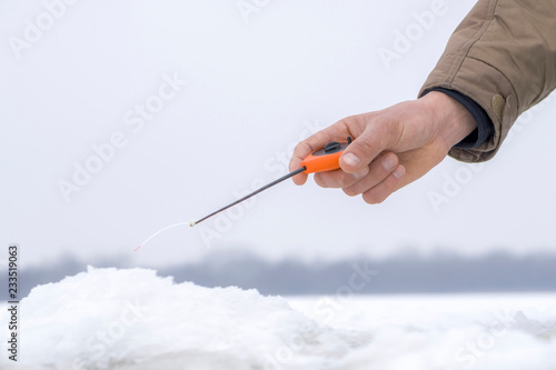 Winter fishing concept. Hand of fisherman with specialised rod above snowy ice.