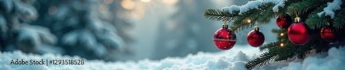 Winter landscape with a fir tree and Christmas baubles hanging from its branches, decorations, winter wonderland