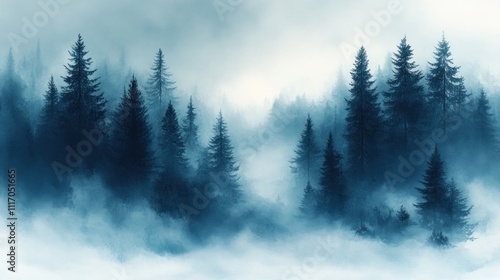 Winter Landscape with Pine Trees in Watercolor Soft Blue and White Colors