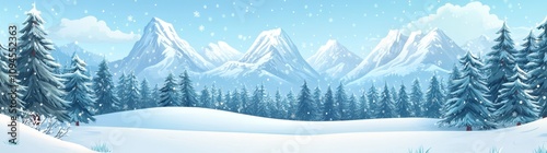 Winter landscape with snow-covered trees and majestic mountains, capturing the beauty of nature in its tranquility.