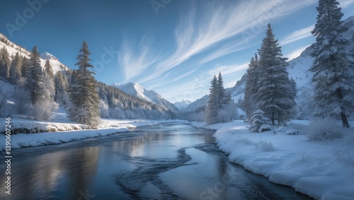 Winter mountain river in a snowy landscape. Landscape featuring a winter mountain.