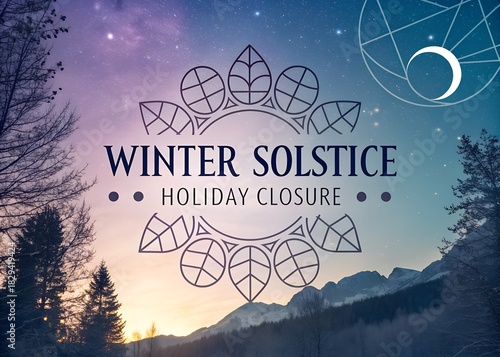 Winter Solstice Holiday Closure Graphic in Snowy Mountain Scene