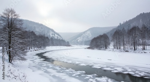 Winter tranquil landscape, Calm snowcovered river beneath misty mountain and barren trees