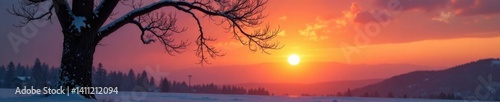 Winter tree silhouette against sunset warm glow, calm, quiet