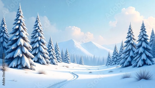 Winter wonderland landscape with snow-covered trees and mountains