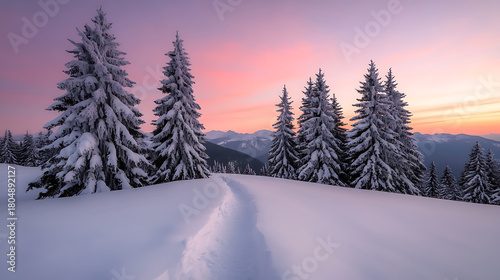 Winter wonderland scene with snow-covered fir trees standing tall against a beautiful pink and orange sky, with the mountains in the background. Snowy landscape.