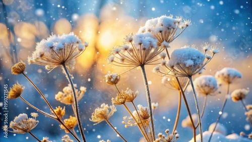 Winter's Gentle Embrace Delicate Snow-Covered Plants Bask in the Golden Hour's Soft Light