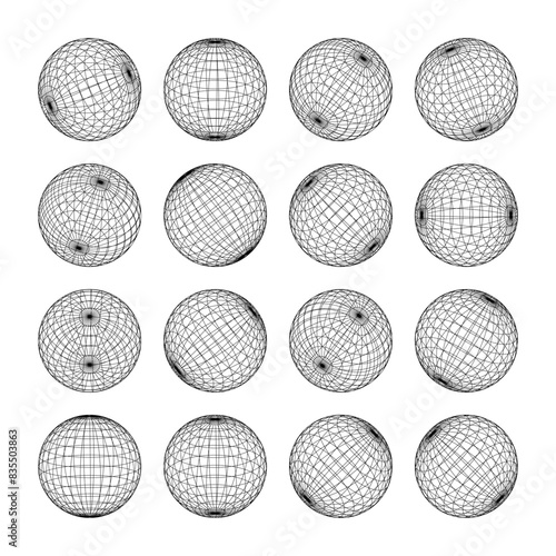Wireframe shapes, lined sphere. Perspective mesh, 3d grid. Low poly geometric elements. Retro futuristic design elements, y2k, vaporwave and synthwave style. Vector illustration