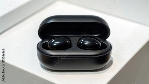 Wireless earbuds in a sleek charging case, displayed on a minimalist surface, showcasing modern tech design.