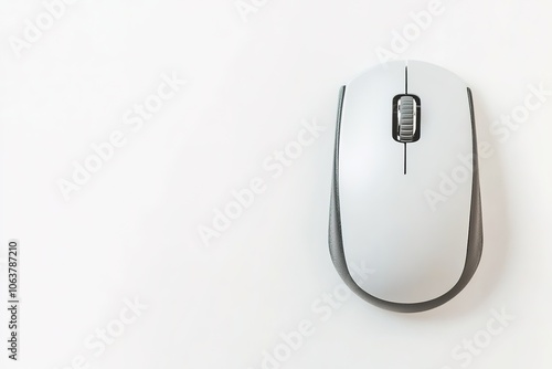 Wireless mouse on white surface, minimalist design.