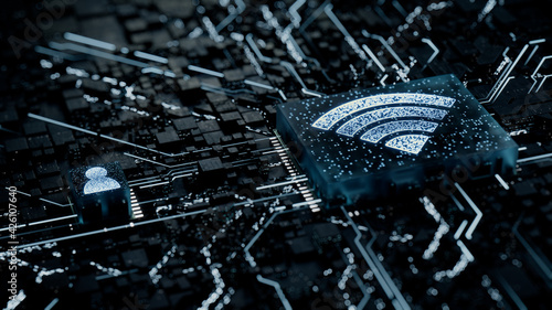 Wireless Technology Concept with wifi symbol on a Microchip. White Neon Data flows between the CPU and the User across a Futuristic Motherboard. 3D render.