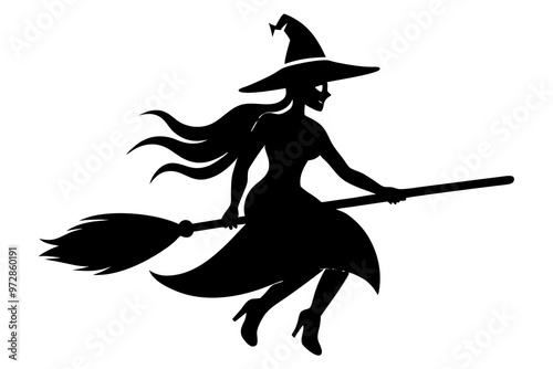 Witch flying on a broomstick silhouette, Halloween witch with broom vector illustration