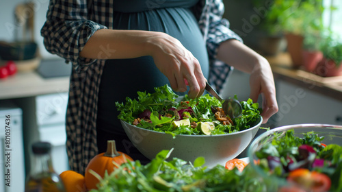 With a sense of joy, the pregnant woman tosses vibrant salad greens with a homemade vinaigrette, her smile growing as she adds a sprinkle of toasted nuts and seeds for added crunch