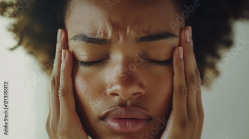Withdrawal symptoms cause headaches. A person massaging their temples with eyes closed