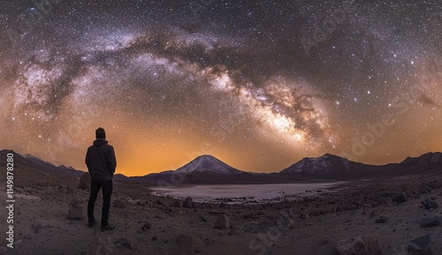 Witnessing the Milky Way's Majesty: A Person Silhouetted Against Starry Night Sky Over Mountains, Desert Landscape. Breathtaking Celestial Display.