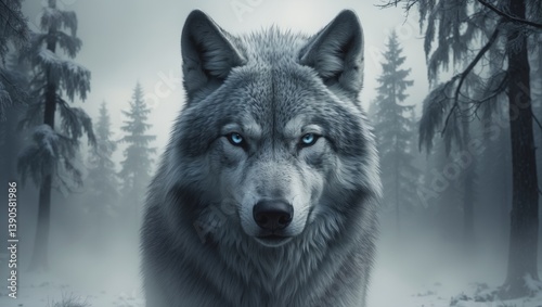 Wolf face on a white background with double exposure effect.