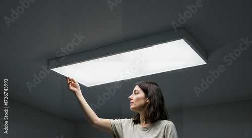 Woman adjusting ceiling light fixture in modern indoor setting