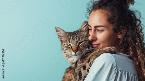 Woman affectionately cuddling with her tabby cat