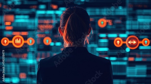 Woman Analyzing Data on Futuristic Digital Display with Graphics