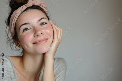 Woman applies anti aging cream for improved skin tone smiling while touching her cheek against a white backdrop