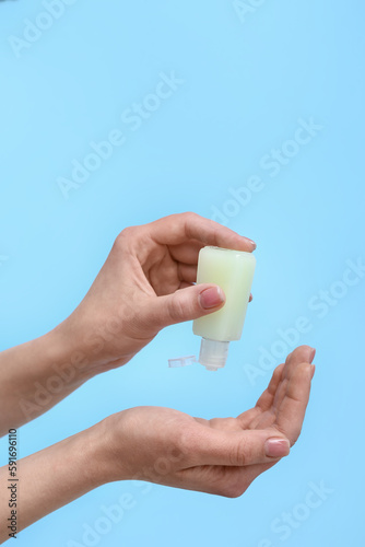 Woman applying sanitizer on blue background