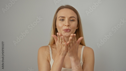 Woman blowing a kiss isolated over white background, showcasing beauty and charm with a confident and warm gesture.