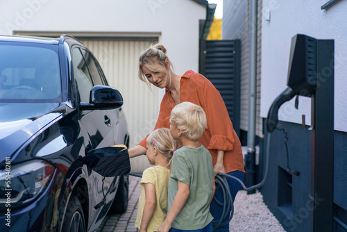 Woman charging electric car in front of children