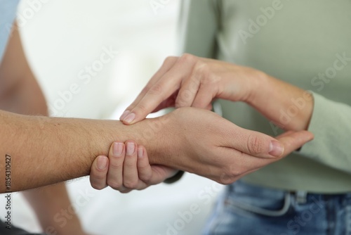 Woman checking man's pulse with fingers indoors, closeup