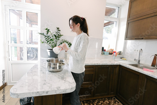 Woman cooking food indoors with a kid