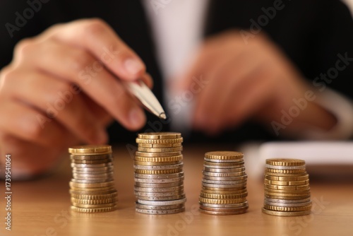 Woman counting coins at wooden table indoors, selective focus