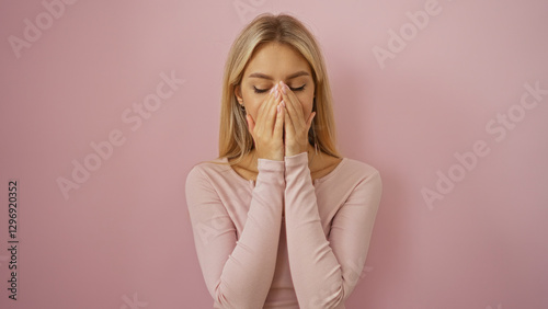 Woman covering her face with hands stands against a pink background, showcasing a moment of emotion, beauty, and contemplation in an isolated setting.