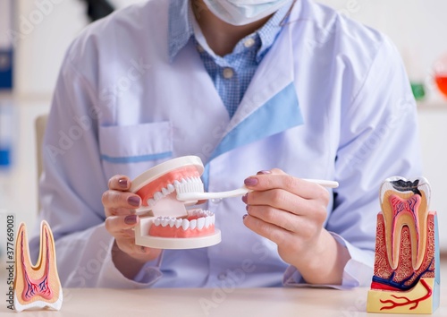 Woman dentist practicing work on tooth model