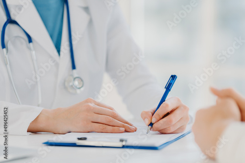 Woman doctor writes down in clipboard, makes prescription for patient, records data for analysis