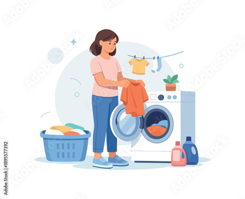Woman doing laundry with washing machine and soap detergent in cozy home setting