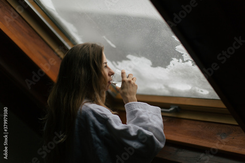 woman drinking water near the window