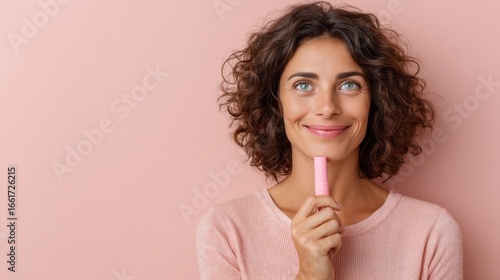 Woman enjoying a moment of self-care while holding a lipstick tube near her mouth against a pink background