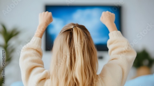 woman enthusiastically watches the series on TV, Generative AI