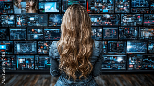 woman examines digital screens, reflecting a futuristic approach to technology and innovation. Her focused gaze suggests deep analysis and the pursuit of advanced solutions