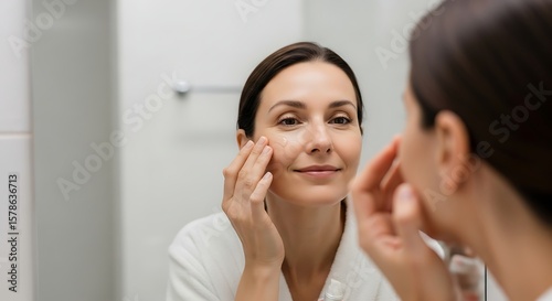 Woman examining her face in mirror