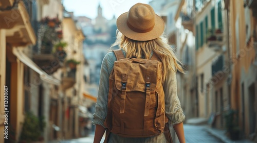 Woman exploring vibrant European town with backpack and straw hat. Colorful streets, summer vacation, historic architecture, urban travel adventure, cultural discovery.